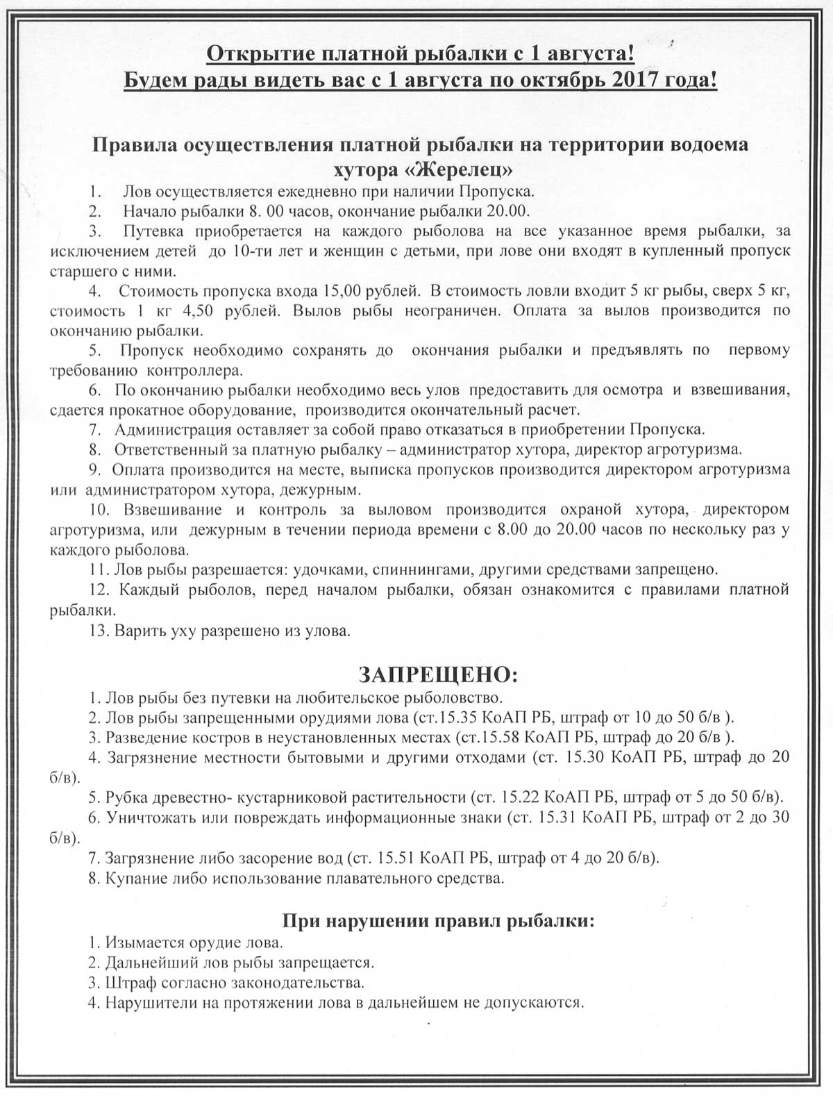 Лов рыбы осуществляется ежедневно при наличии Пропуска